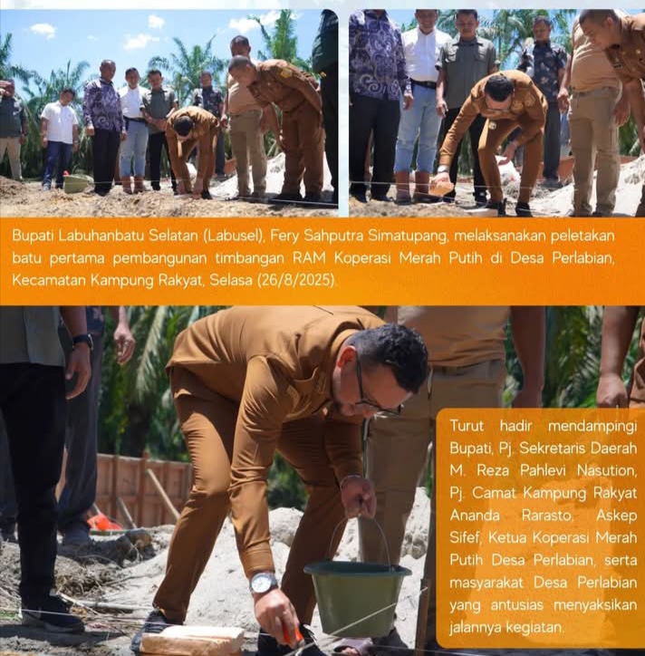 Bupati Labuhanbatu Selatan (Labusel), Fery Sahputra Simatupang, melaksanakan peletakan batu pertama pembangunan timbangan RAM milik Koperasi Merah Putih di Desa Perlabian, Kecamatan Kampung Rakyat, Selasa (26/8/2025).